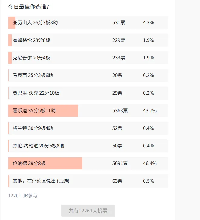 今日JRs评选已经结束,快船球员科怀-伦纳德以46.4%的得票率、5691票当选今日JRs评选最佳球员(数据截止此帖发布前)。